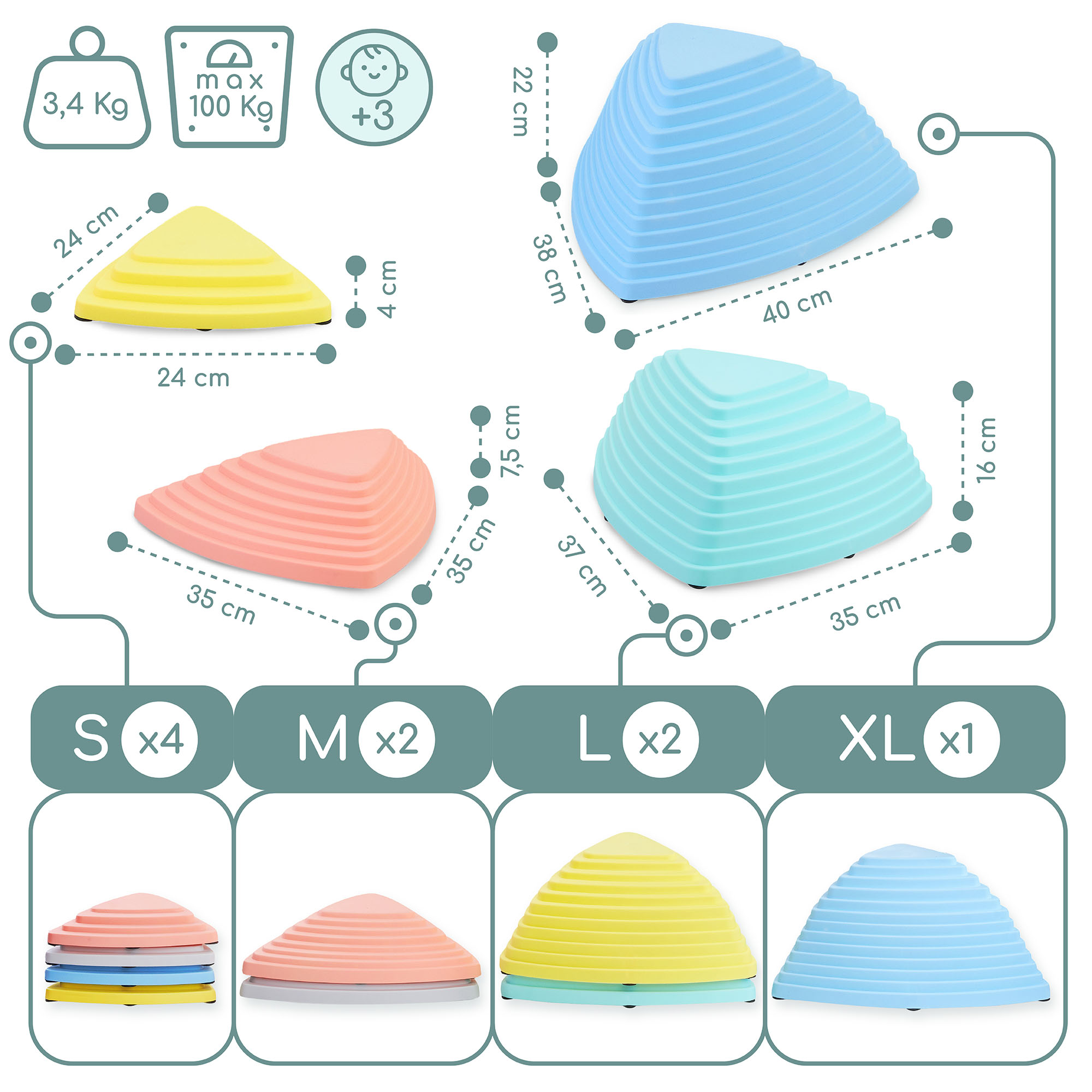 Sættet med balancesten indeholder 9 stykker i forskellige størrelser og farver. Du skal blot lægge dem ud med en vis afstand til hinanden for at give dit barn spændende underholdning. At balancere på en række sten er en fremragende træning af balancen og af den motoriske koordination. Sættet er ikke kun et godt valg til hjemmet, men også til børneværelset eller genoptræningsrummet.