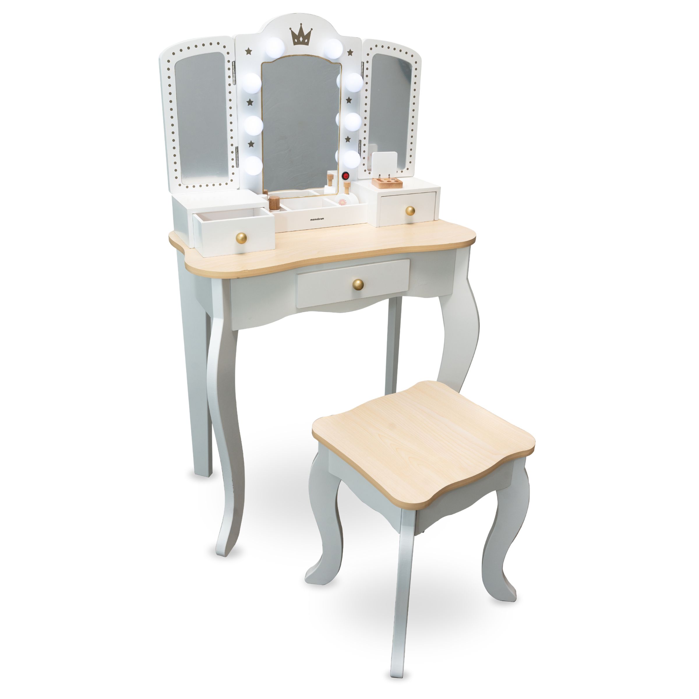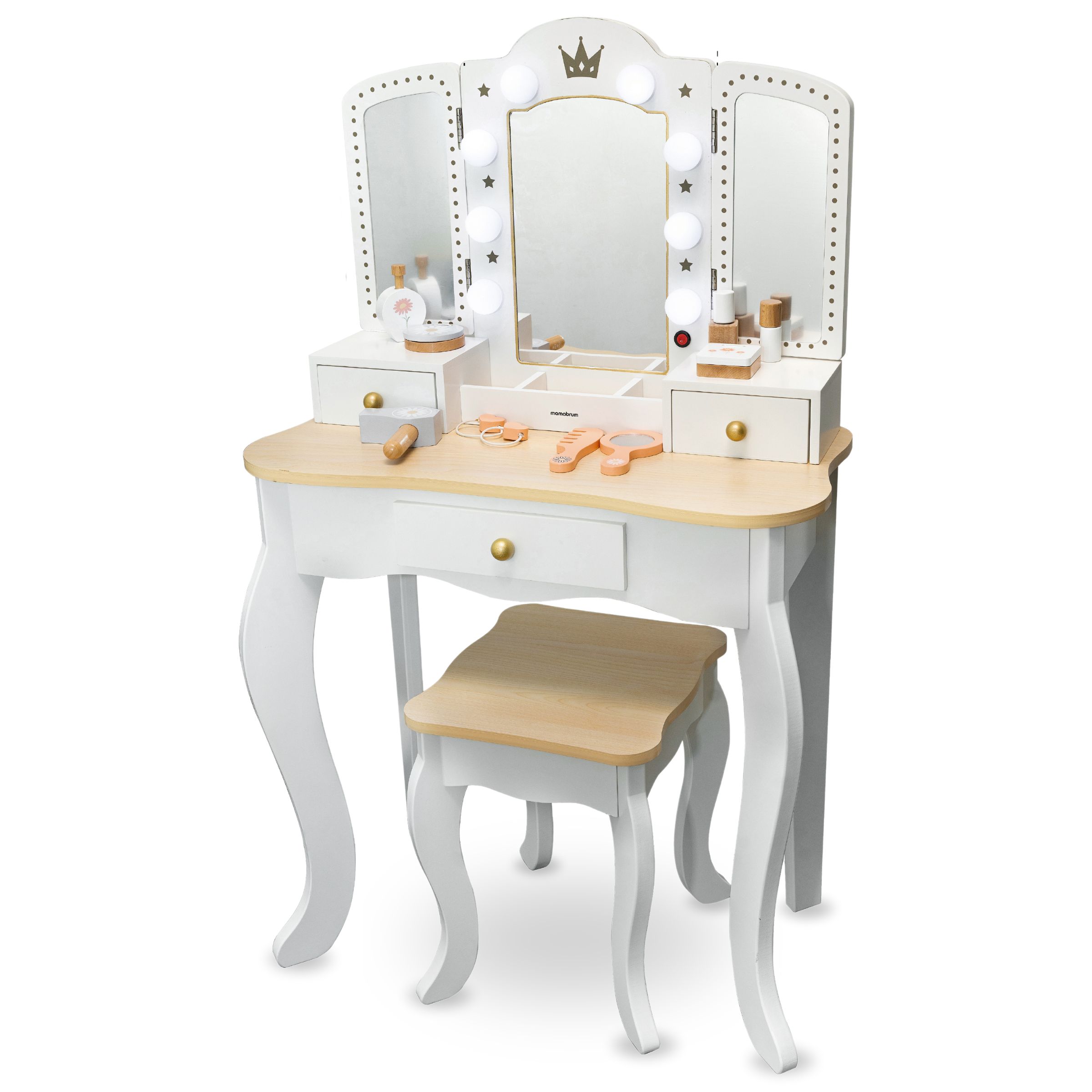 Atmosfærisk, blid belysning leveres af 8 LED-pærer. Spejlet kan tages af, så sminkebordet bliver til et lille skrivebord. Hvis du vil se dit ansigt fra en anden vinkel, skal du blot justere sidespejlene. Toiletbordet i træ er en unik gaveidé til den lille!