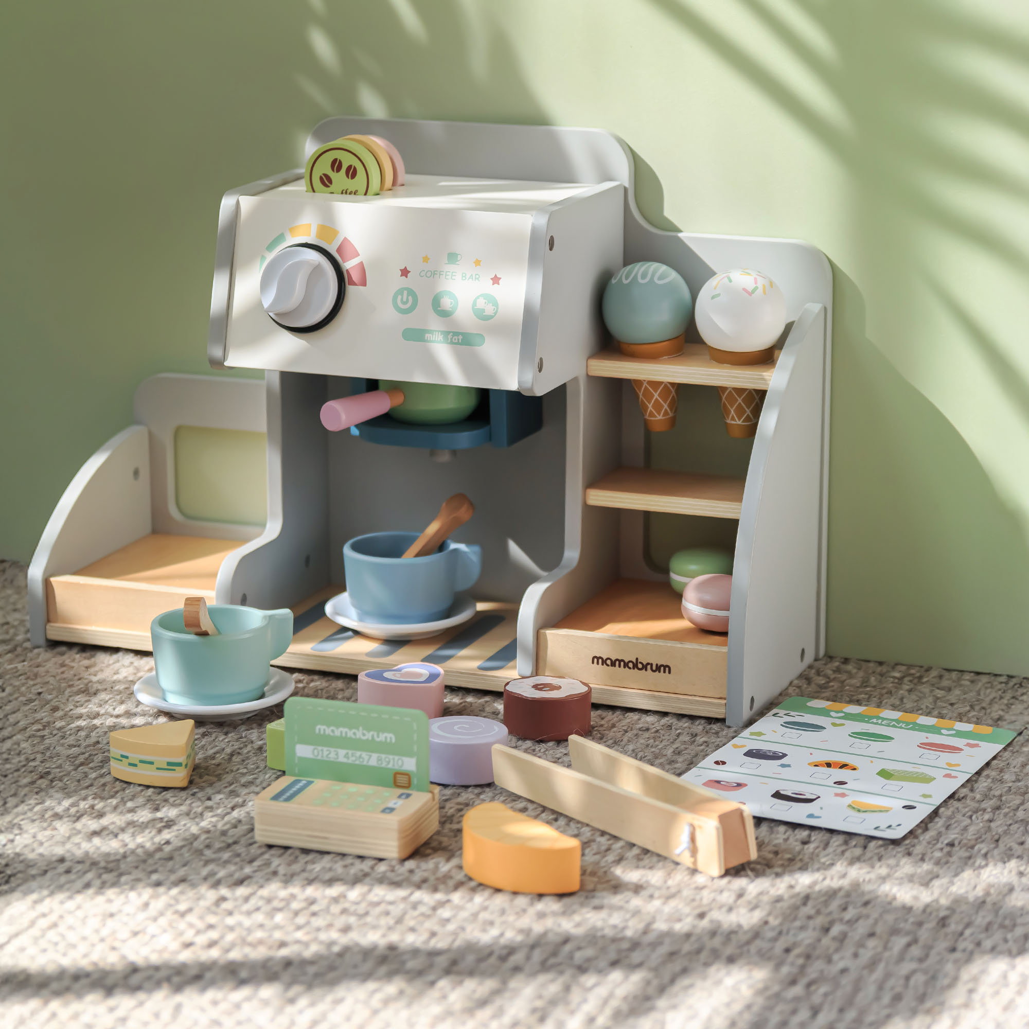 Dette smukt udformede træsæt vil føre dit barn ind i en verden af aromatiske drikke og søde sager! Dit barn kan tilberede kaffe, servere is og tage imod betaling - og derefter gentage det hele i et nyt legescenarie. Med det omfattende tilbehør kan du lave dine egne menuer og have timevis af sjov med rolleleg. At lege barista udvikler kreativitet og fingerfærdighed i små hænder.