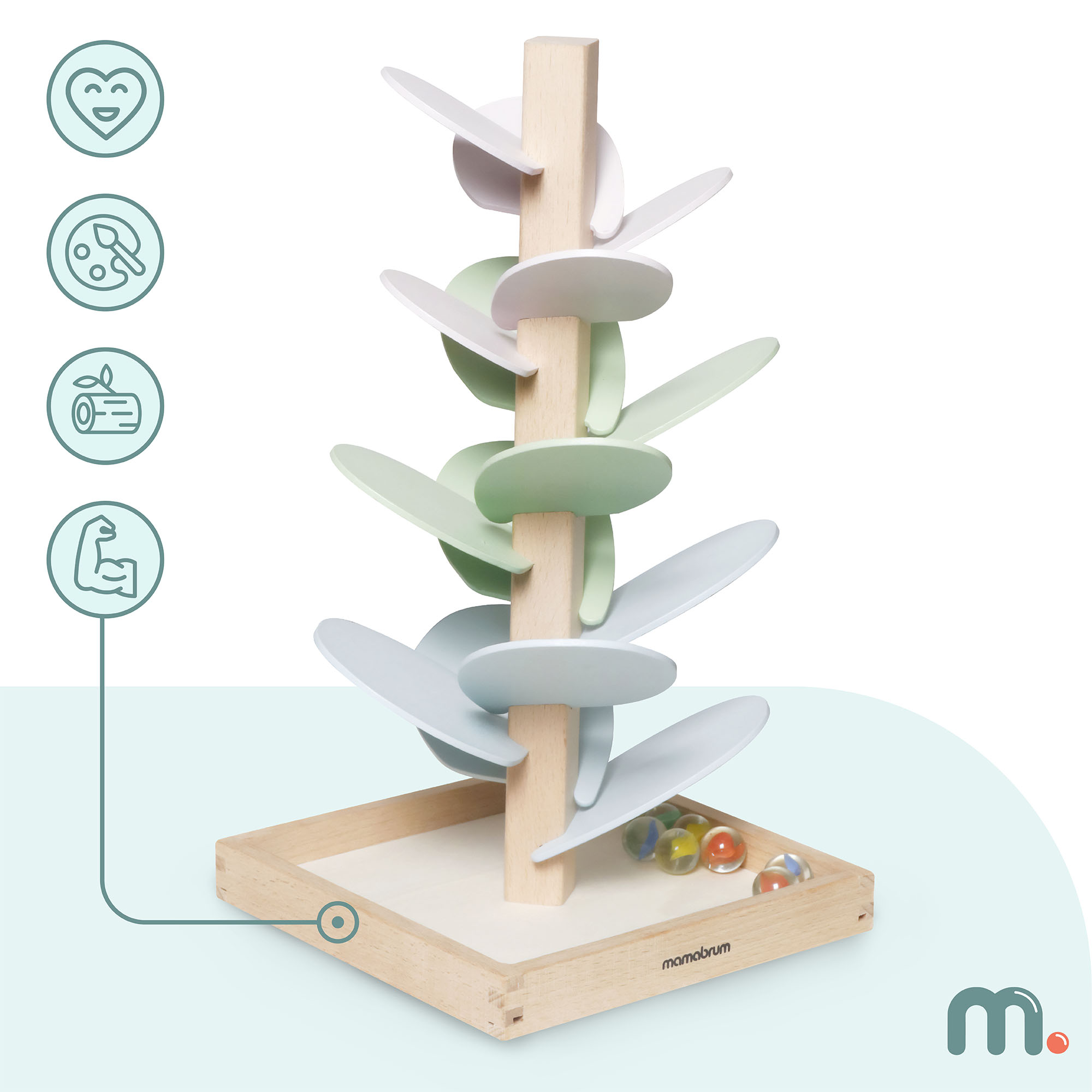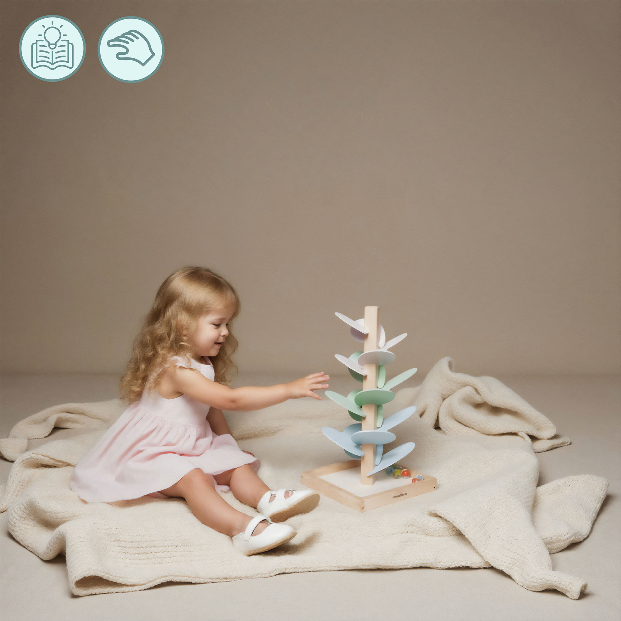 Dette ekstraordinære legetøj tager dit barn med ind i en verden af farver og lyde! Placer blot bolden på toppen af træet, og se den rulle ned fra blad til blad, mens den laver rytmiske, fortryllende lyde. Det er ikke kun en kilde til sjov, men også en god træning for dit barns små hænder, sanser og fantasi. Med denne kombination fremmer det udviklingen på en naturlig og engagerende måde.