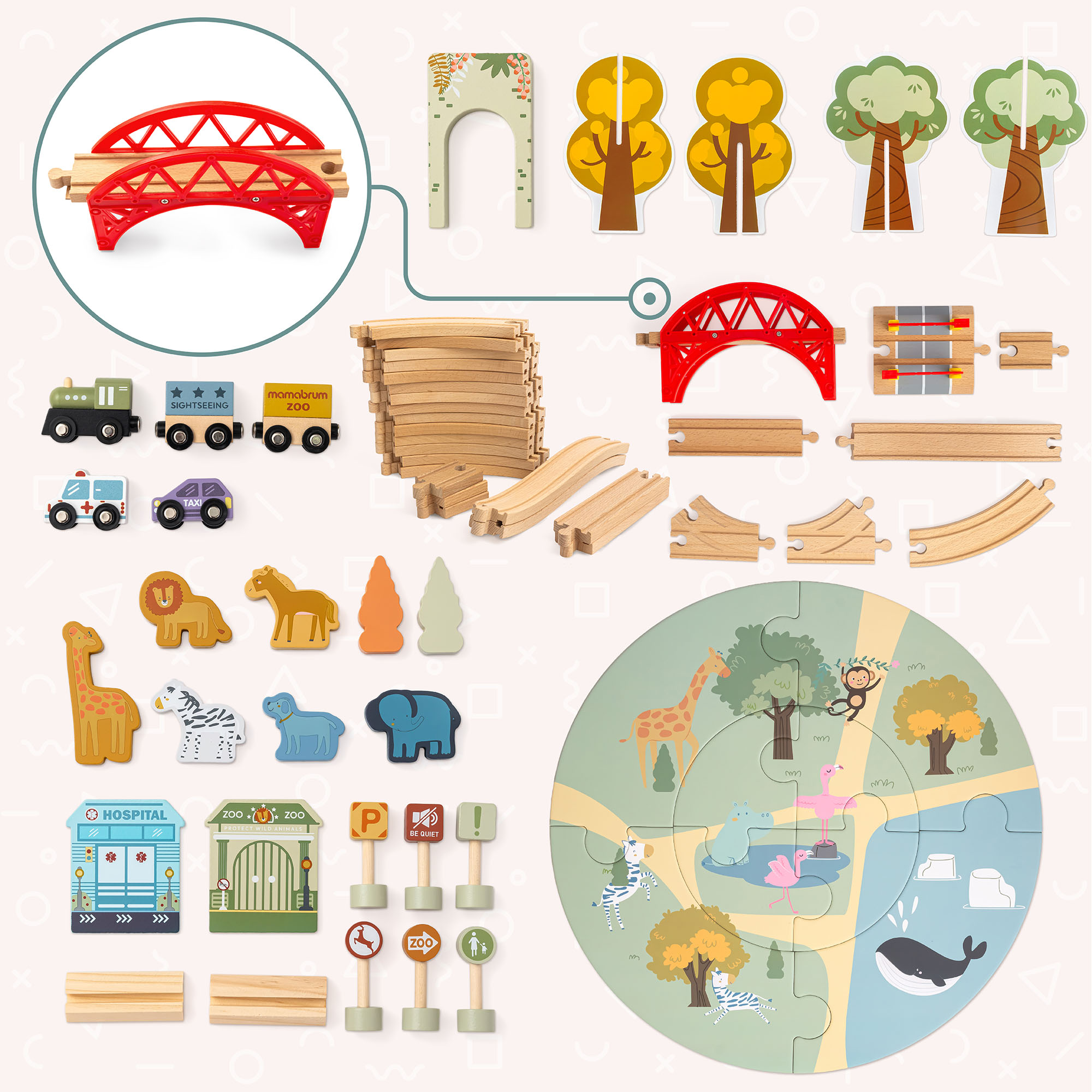 Sættets omdrejningspunkt er den slående røde bro og træporten til zooen , som tiltrækker børns opmærksomhed og skaber adskillige legemuligheder. Toget med sine vogne passerer over broen og når zooporten, hvor safariens magiske verden venter . Dette er en fantastisk mulighed for at lære sociale roller og udvikle kreativitet – børn kan finde på historier om at besøge zoologisk have eller passe dyr.