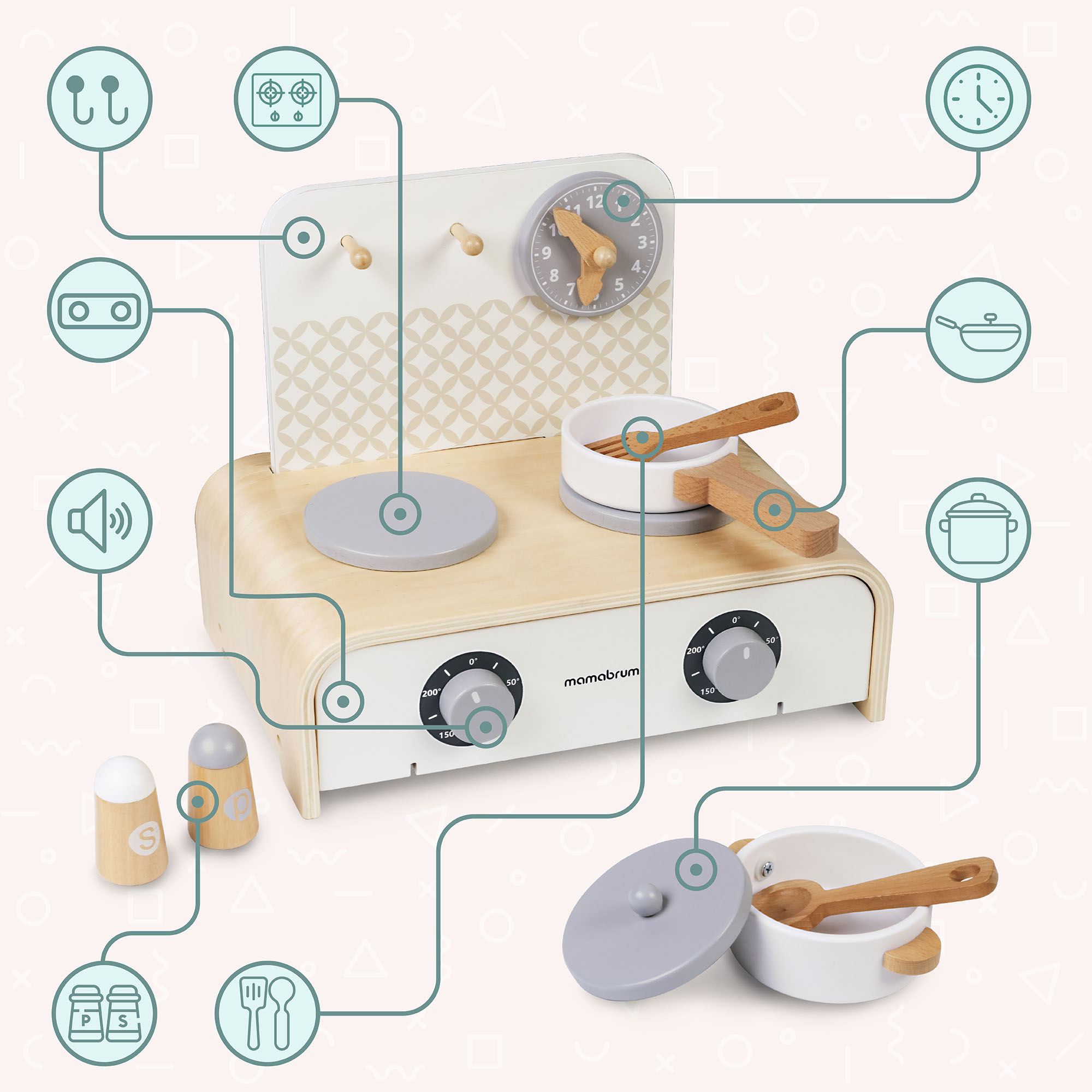 Dette minikøkken har alt, hvad en lille kok behøver for at starte sit kulinariske eventyr. Sættet indeholder gryder, en stegepande, en salt- og peberbøsse og træbestik , så de kan genskabe hverdagens køkkensituationer. Ved at dreje på klikknapperne, måle tiden på uret og "lave mad" på de to brændere kan børn imitere voksne og lave deres egne opskrifter, hvilket tilføjer realisme og spænding til legeoplevelsen.