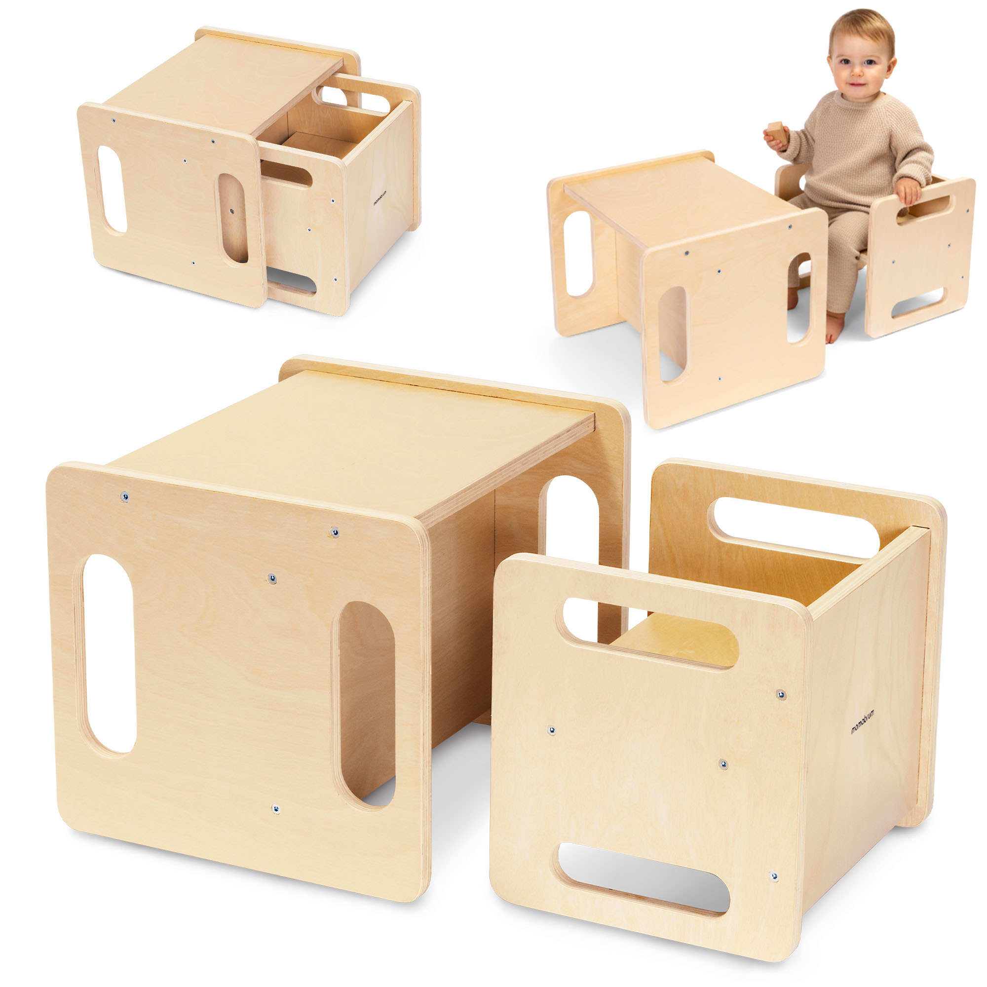 Træbord og stol med trædestensfunktion – et multifunktionelt Montessori-sæt til børn