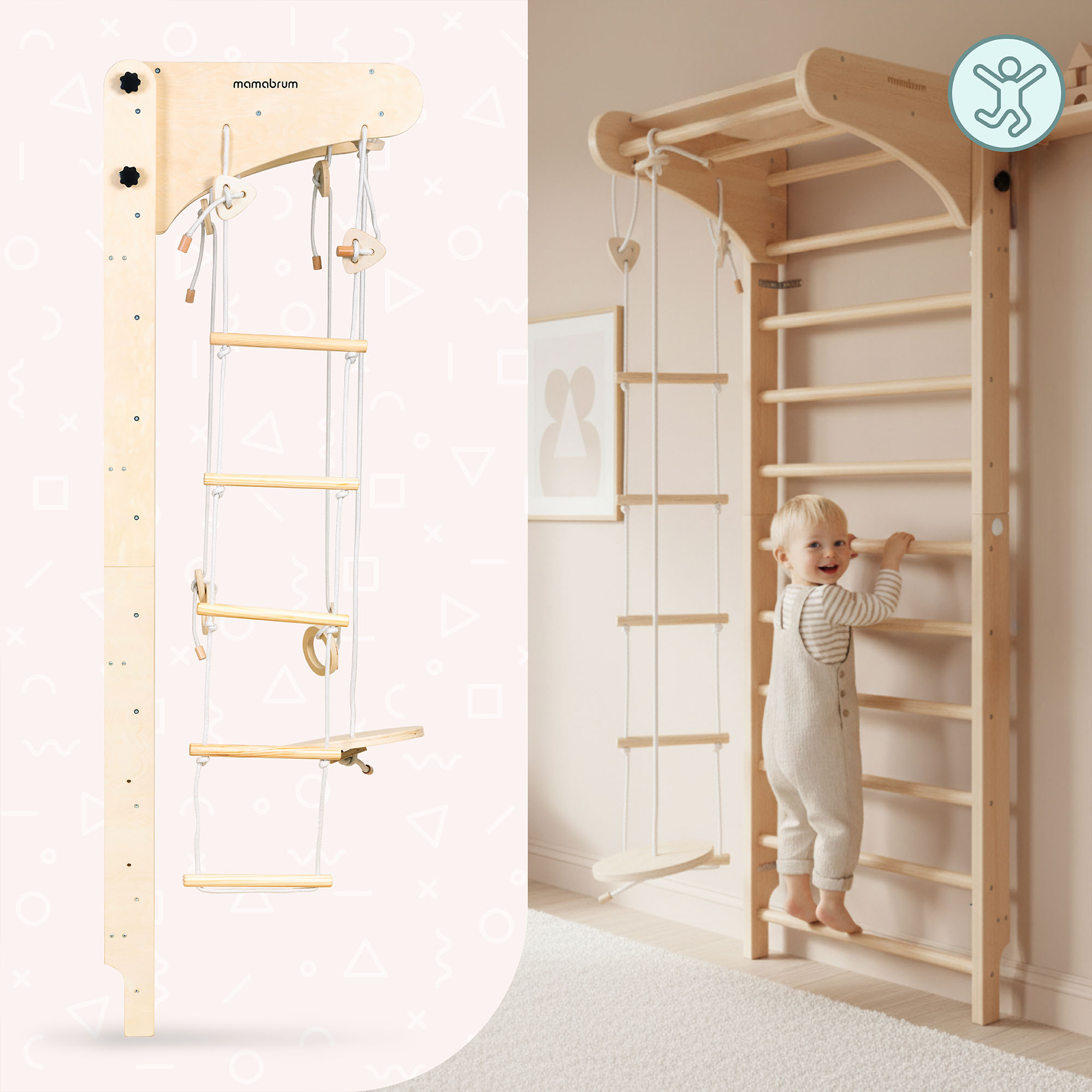 Trægymnastikstige til børn med tilbehør - en tallerkengynge, gymnastikringe og en rebstige