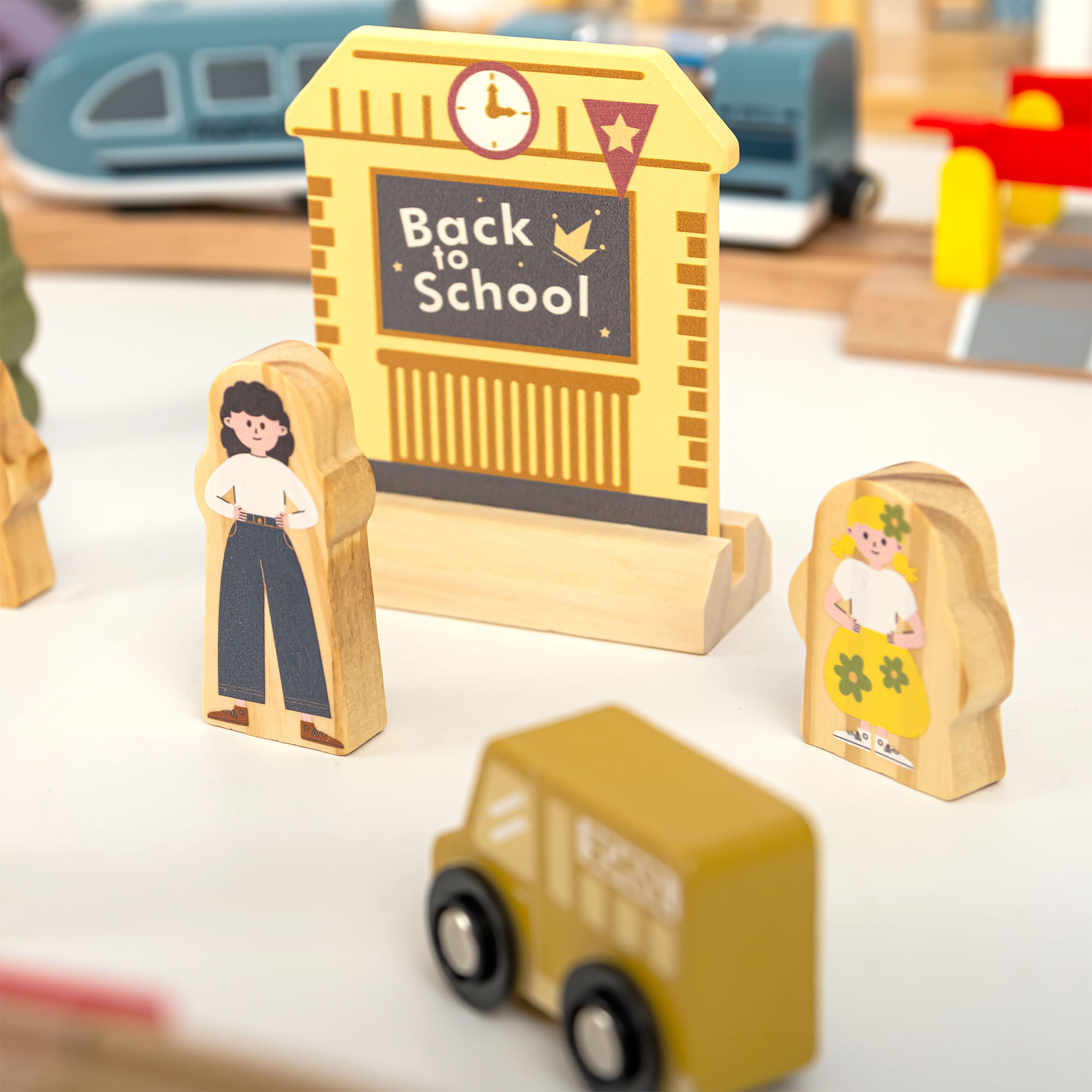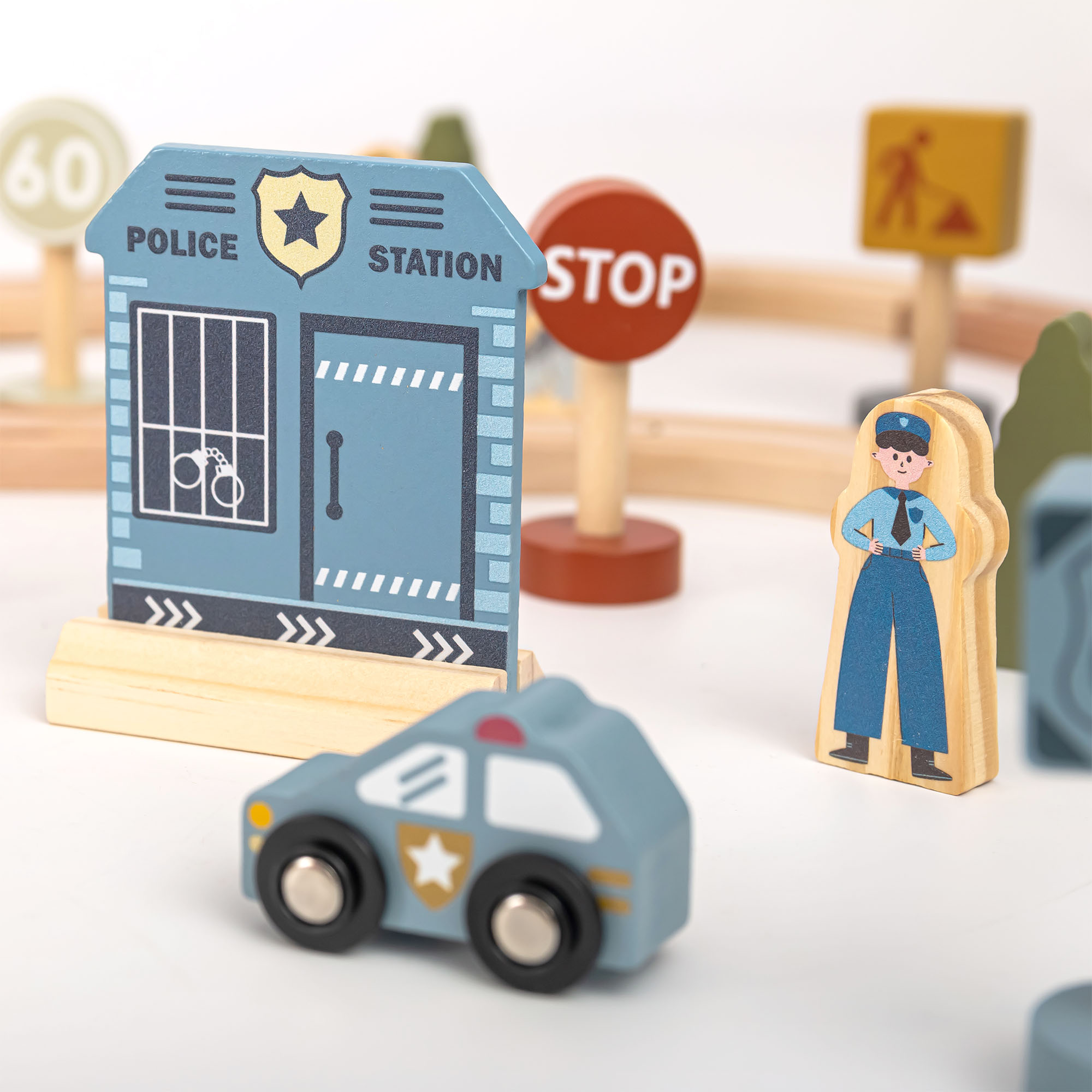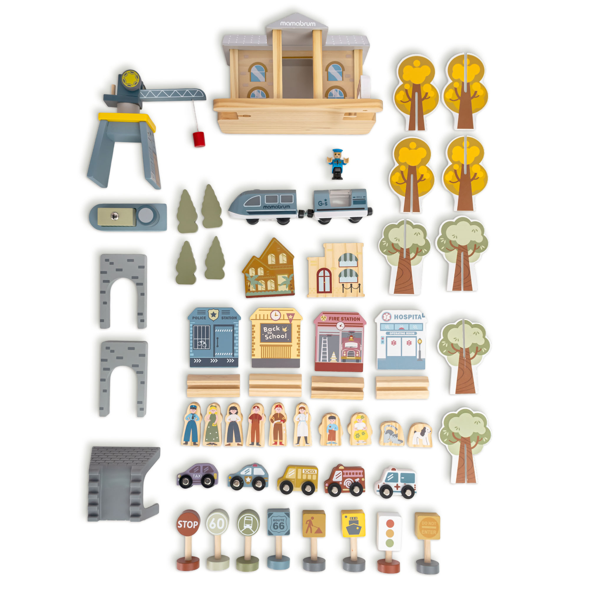 Sættet indeholder alt, hvad der skal til for at skabe en travl by: en skole, et hospital, en brandstation, en politistation , vejskilte, træer og beboerfigurer. Børn kan rollespille hverdagsscener – redning, undervisning, patruljering og trafikstyring. At lege byen udvikler empati, forståelse for sociale roller og stimulerer kreativitet. Ethvert barn kan være lokomotivfører i dag og brandmand eller læge i morgen.