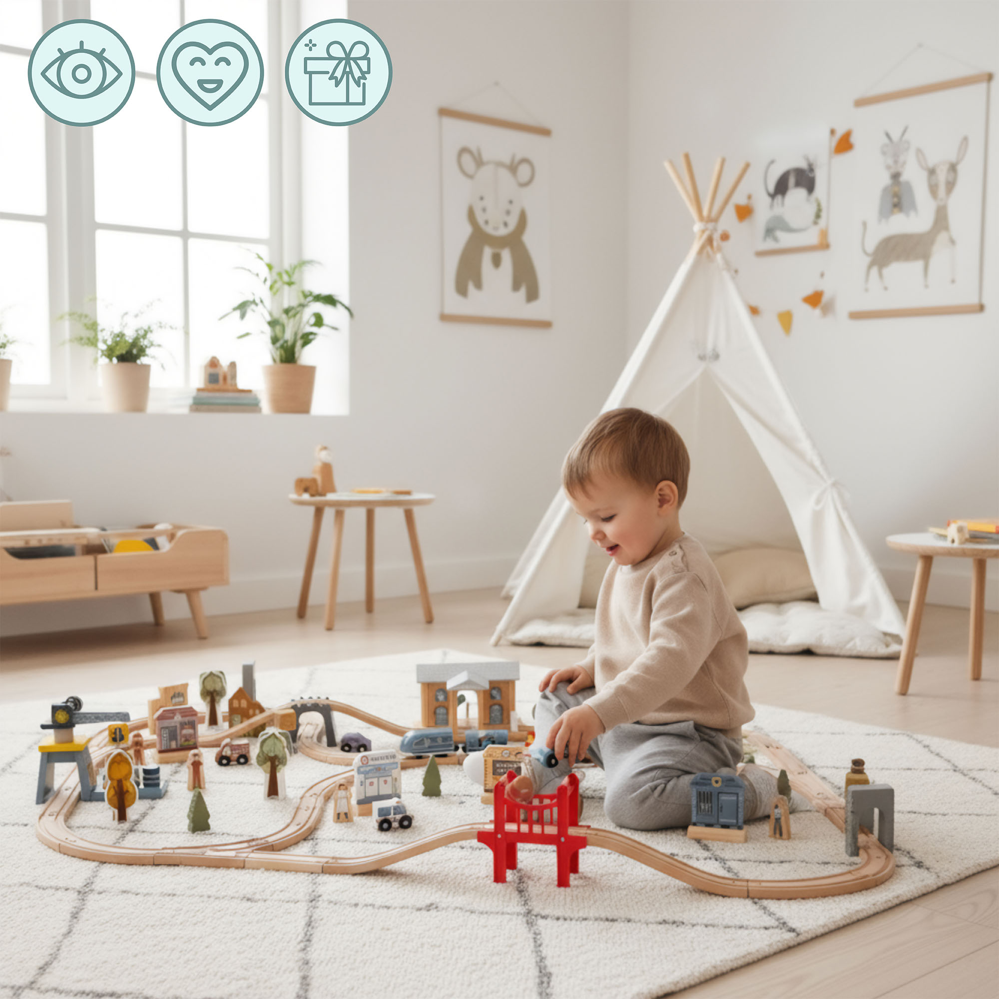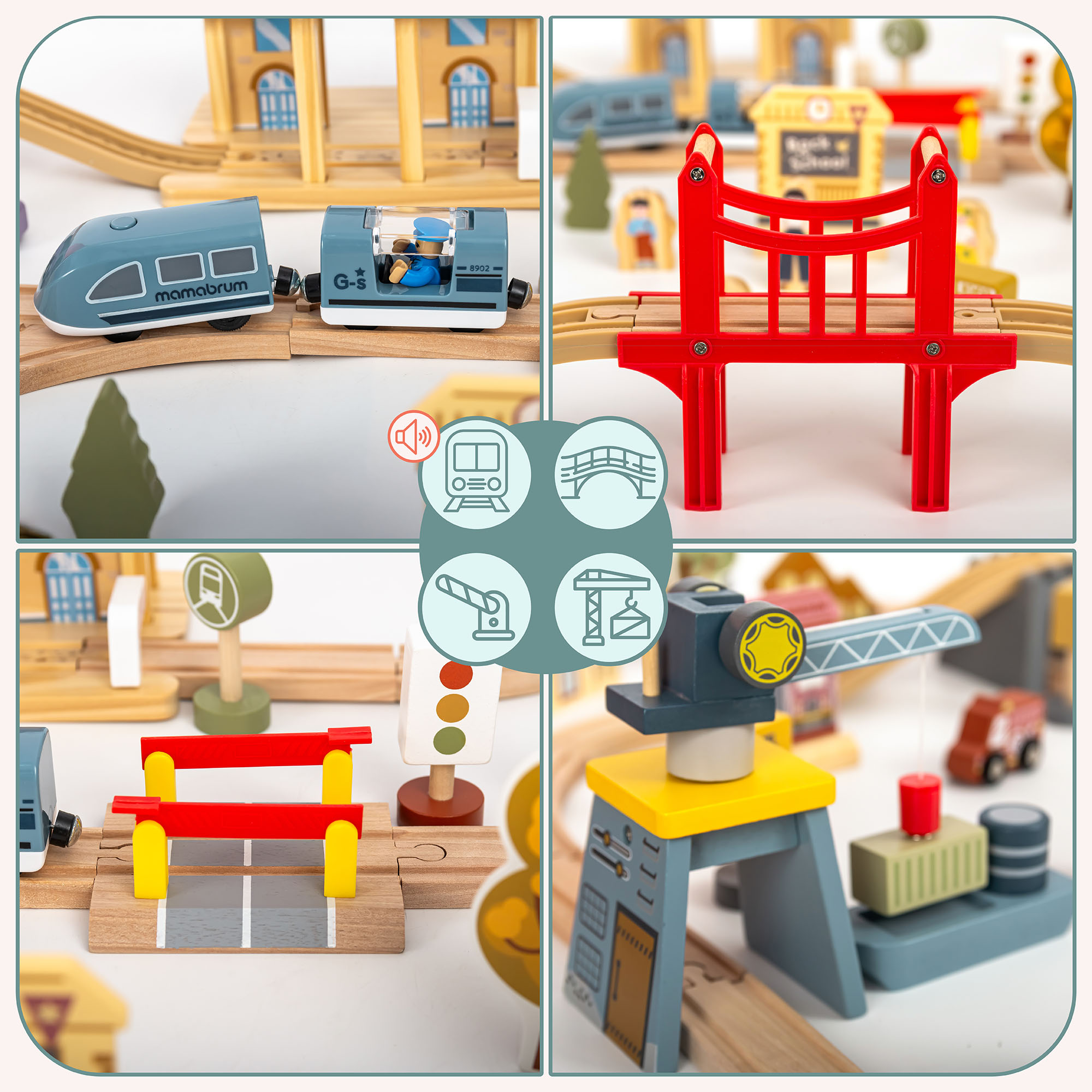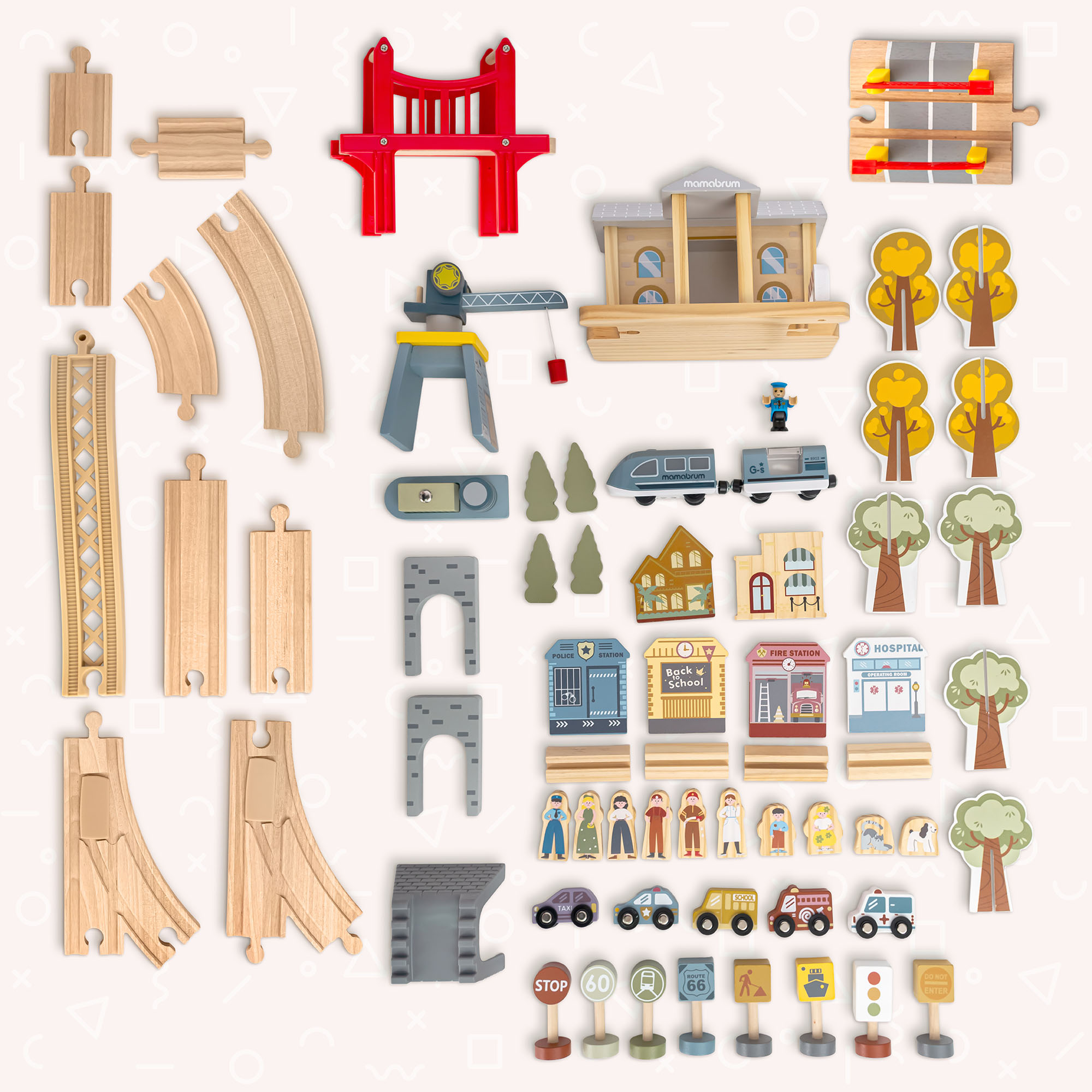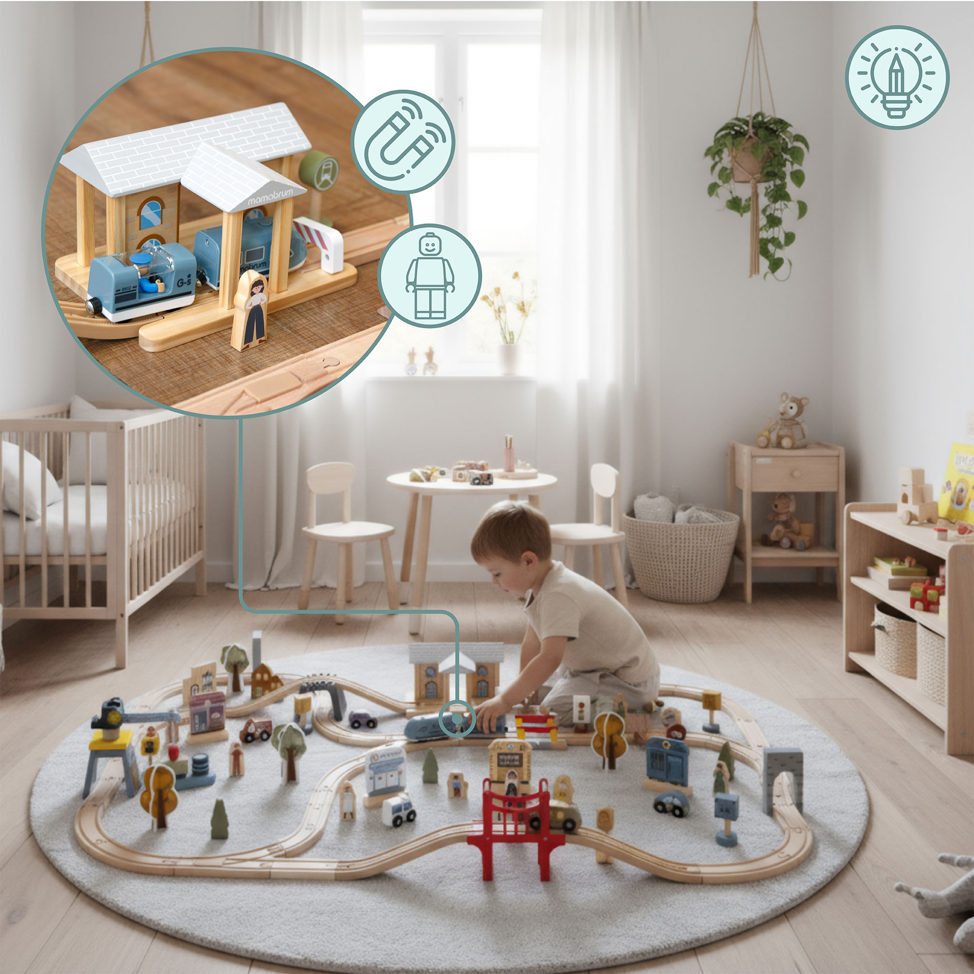Det er ikke bare skinner og et tog – det er en hel by med broer, en kørende kran, et skib, bygninger, biler og figurer, der giver børn mulighed for at skabe uendelige historier. Det elektriske lokomotiv, med realistisk lyd, kører over broen, passerer stationer og stopper ved skolen, hospitalet og brandstationen. Hver rejse er et nyt eventyr i en verden af kreativ leg!
