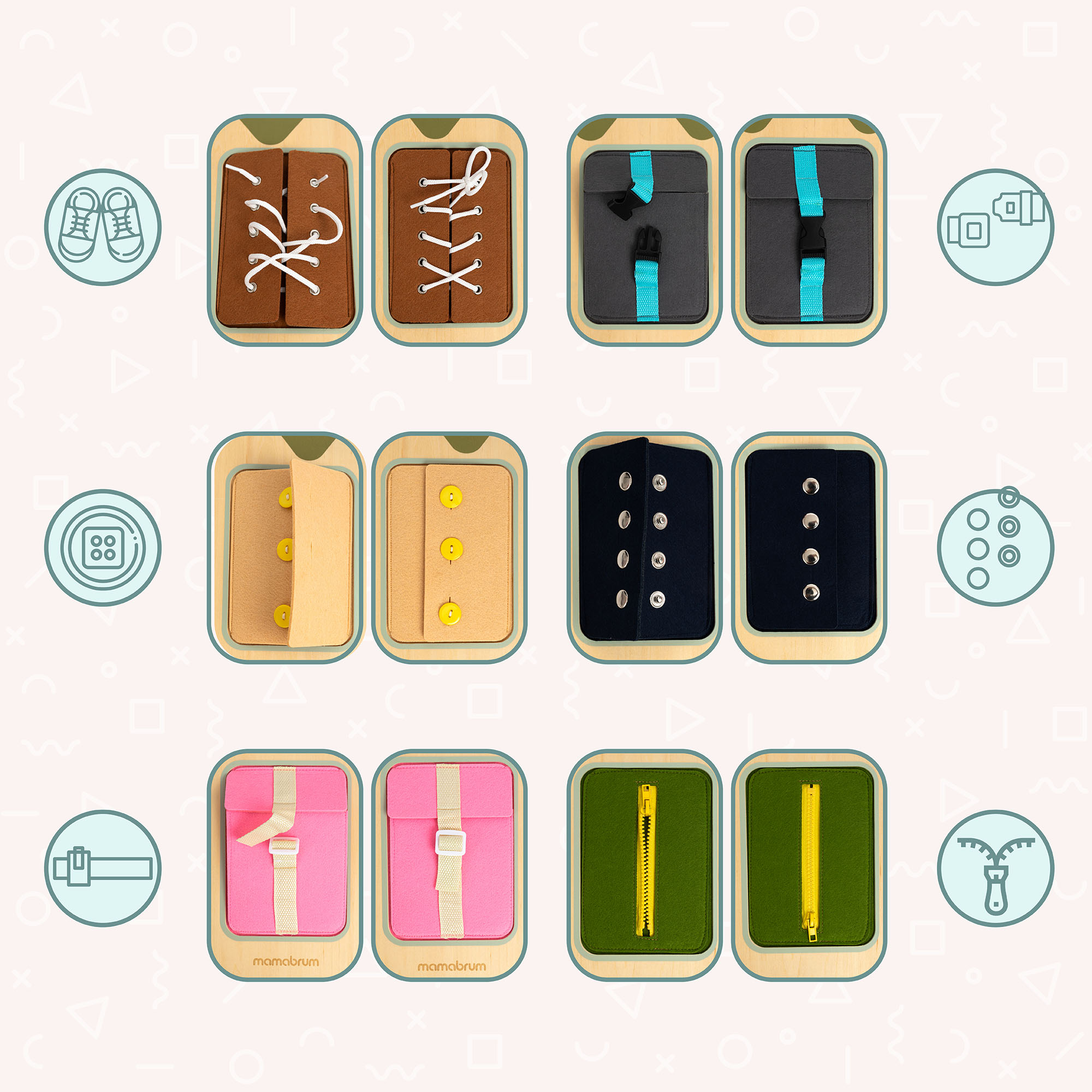 Det, der adskiller dette bræt fra andre, er variationen af elementer . Småbørn er ikke begrænset til kun én mekanisme – der er seks helt forskellige aktiviteter at udforske: snørebånd, knapper, tryklåse, en tryklåsspænde, en justerbar spænde og en lynlås. Hvert panel præsenterer en ny udfordring og en anderledes måde at lege på, hvilket sikrer, at børn ikke keder sig efter blot et par minutter. I stedet for at gentage den samme aktivitet igen og igen, har de mulighed for at eksperimentere og opdage , hvilket fremmer deres nysgerrighed og iver efter at lære.