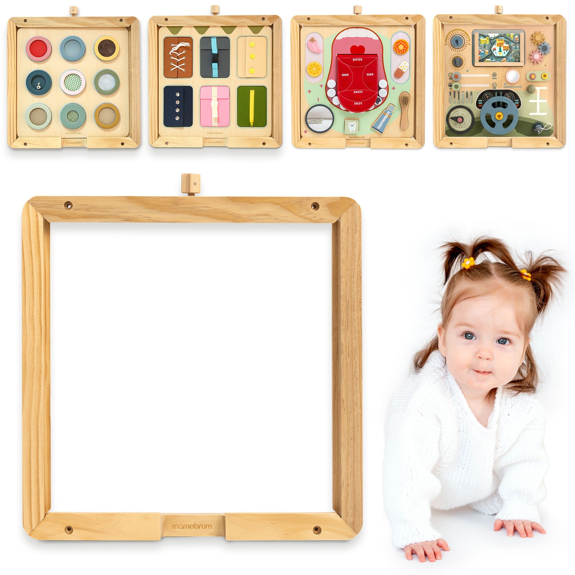 Takket være den træmonterede monteringsramme kan enhver pædagogisk tavle blive til et unikt, hængende legeområde . Monteret på væggen forbliver den stabil og altid klar til nye aktiviteter. Børn har nem adgang til den, kan frit bevæge elementerne, matche former og øve fingerfærdighed – alt sammen i en sikker, ergonomisk position. Det er den perfekte løsning, der forvandler en almindelig væg til et inspirerende rum til læring, udvikling og kreativ leg hver dag.