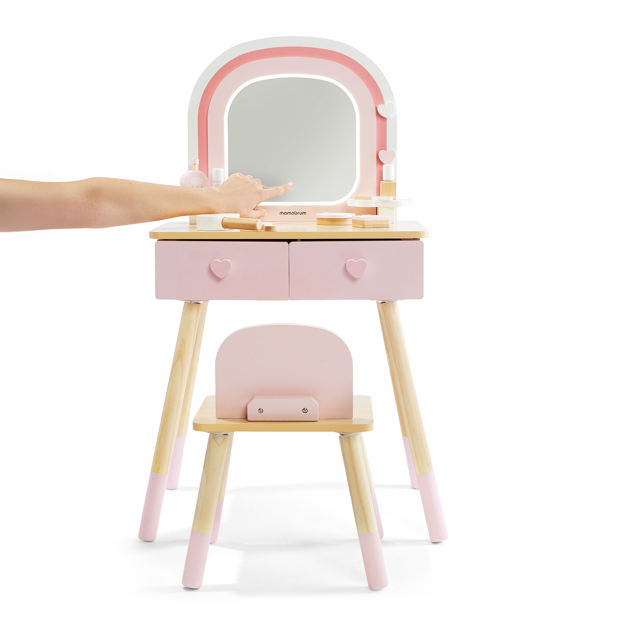 Dette toiletbord i træ med spejl, LED-belysning og stol er et unikt møbel, der transporterer børn til en verden af sjov, stil og kreativitet. Designet med sans for detaljer kombinerer det funktionalitet, elegance og sikkerhed. Pastelfarver, diskrete udsmykninger og naturligt træ gør det til en perfekt tilføjelse til et børneværelse og et sandt midtpunkt.