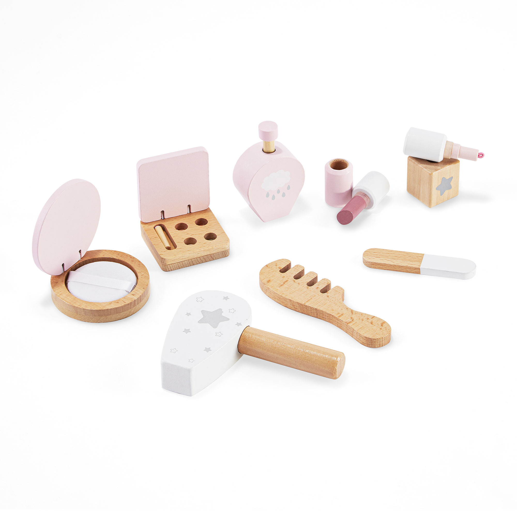 Sættet indeholder otte kosmetikartikler i træ , der ligner rigtige sminkeartikler til voksne. Sættet indeholder en øjenskyggepalette, neglelak, parfume, pudder, kam, hårtørrer, læbestift og neglefil.