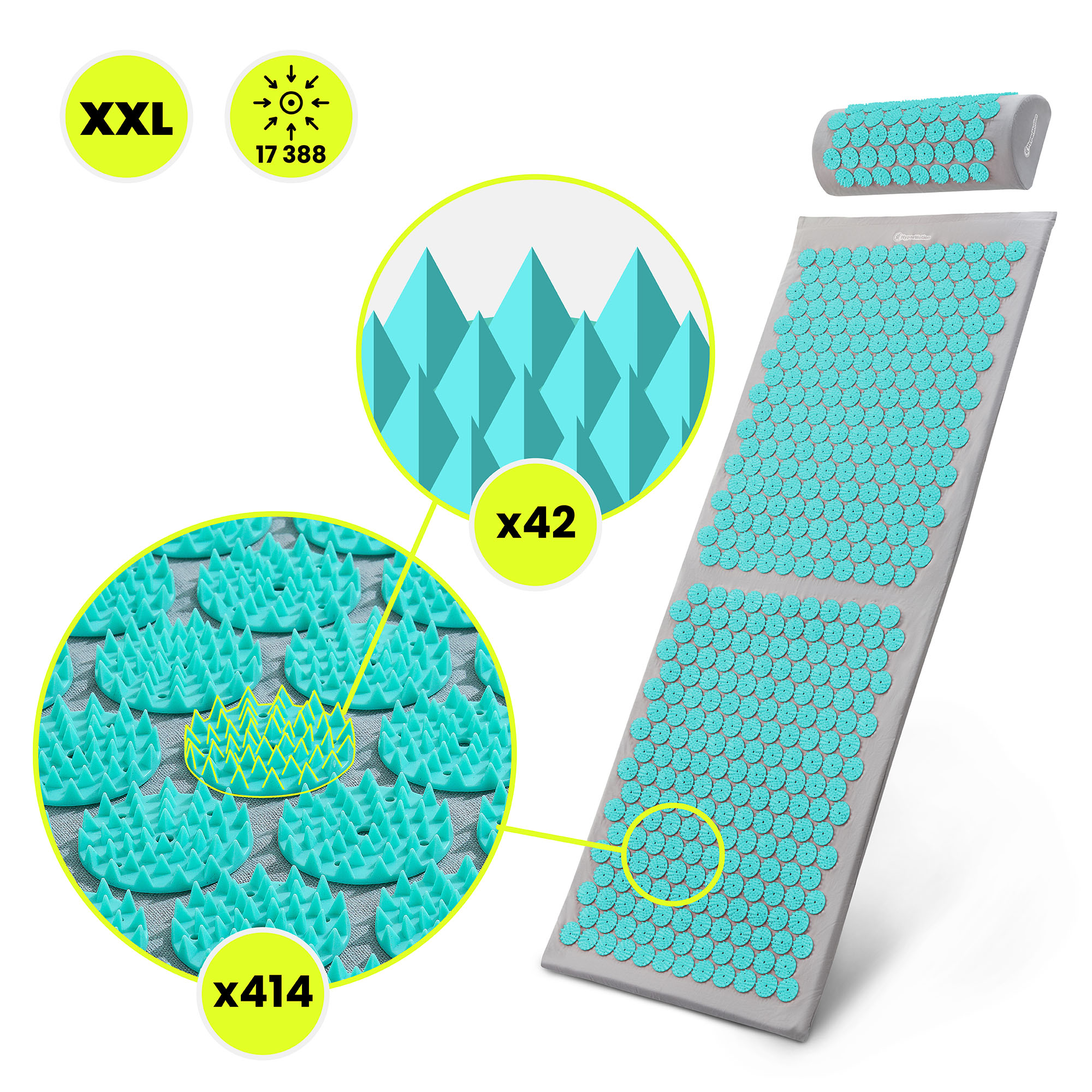 Stor akupressurmåtte med pude og betræk - 130 cm HyperMotion grå-mint