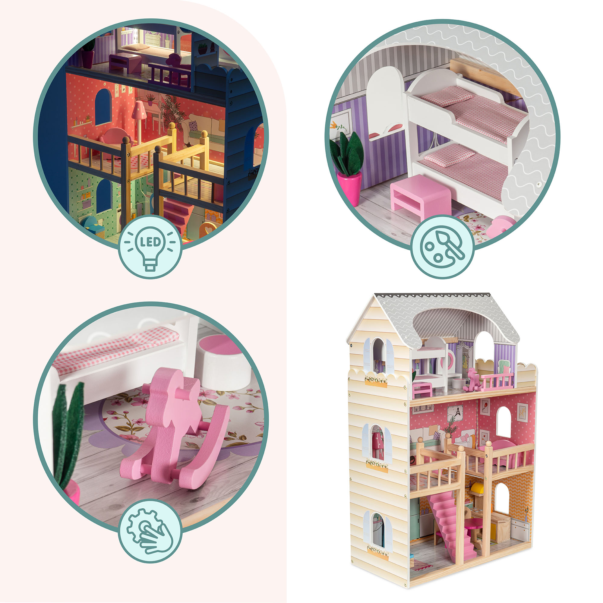 Kæmpe dukkehus i træ med møbler og LED-belysning!