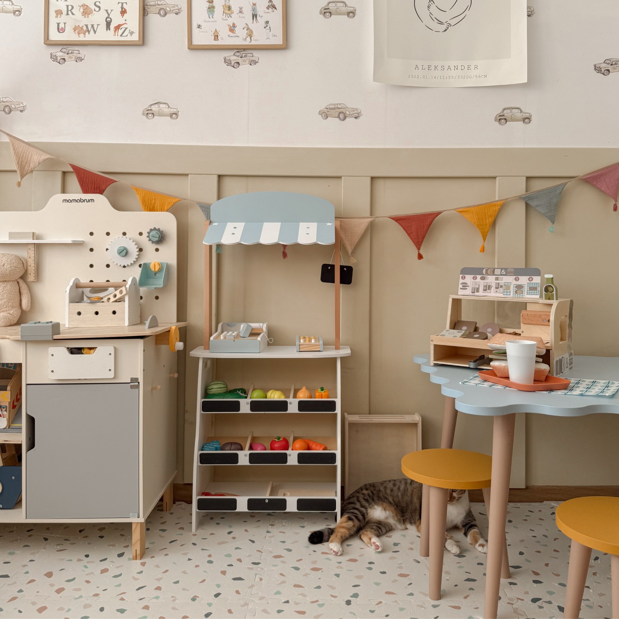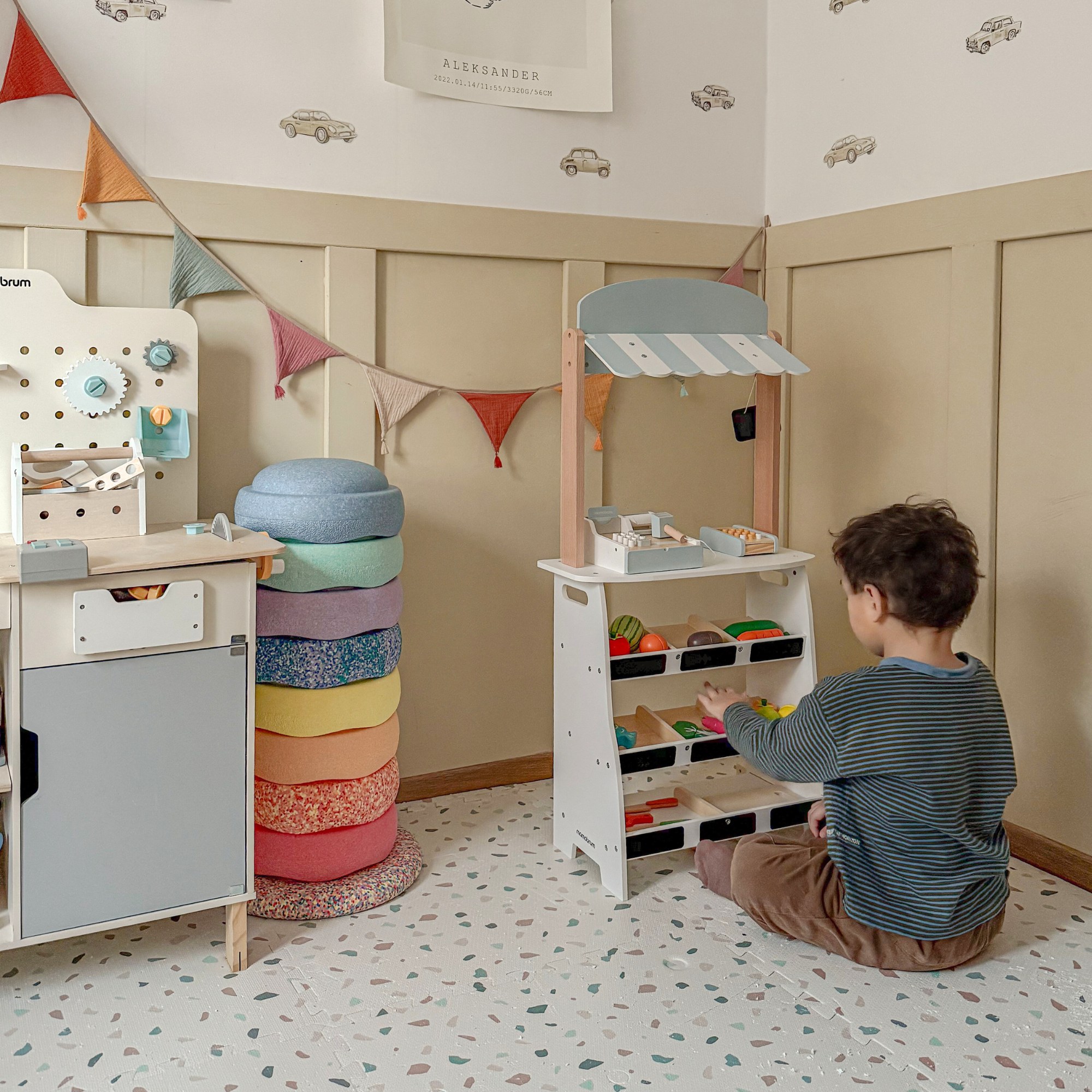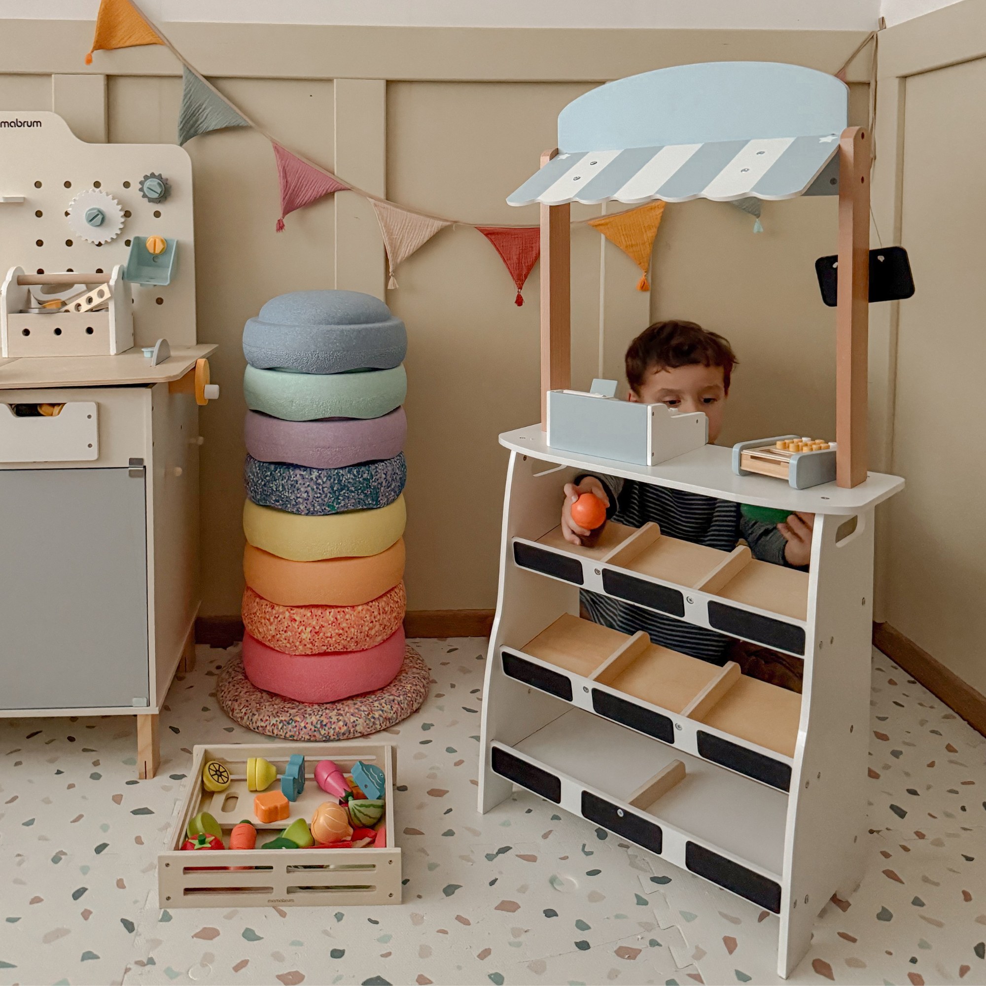 Ved boden på markedsdagen er der så meget snak om, at der er en ny sælger, som har et godt lager af grøntsager! Her er et legetøj, der ikke kun vil lære dit barn om handel, men også om sund kost.