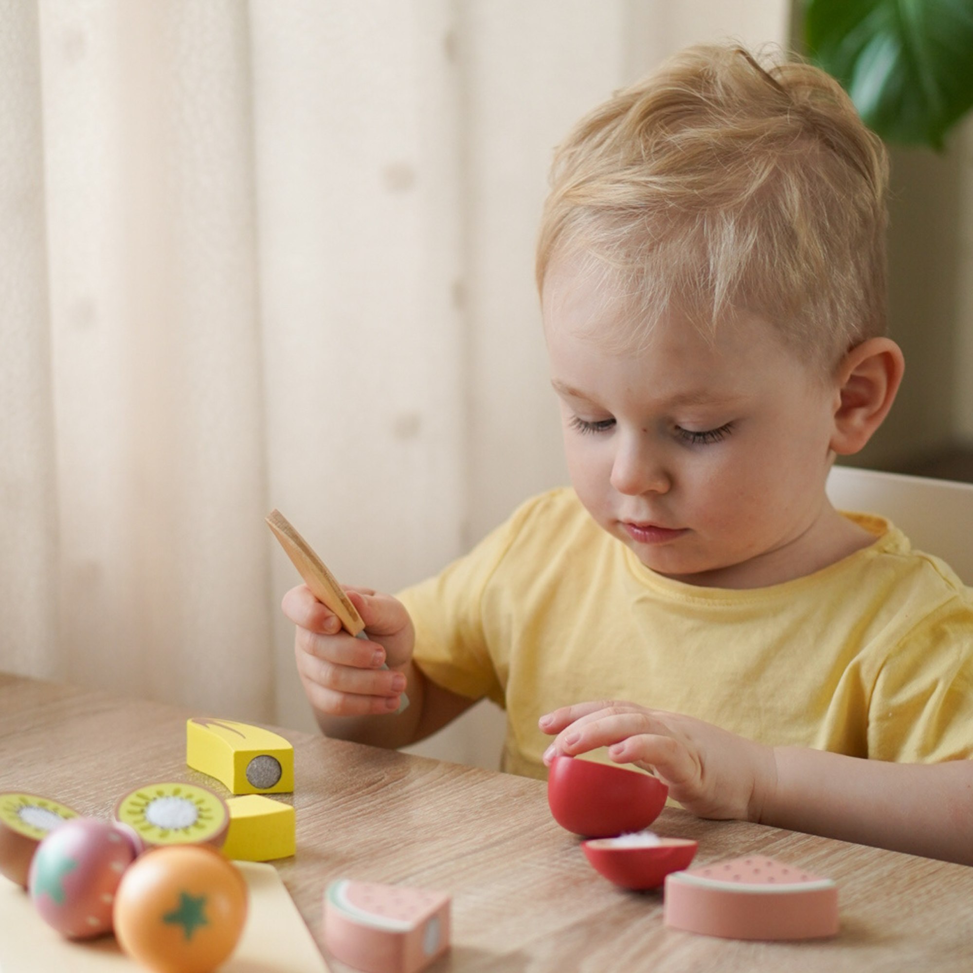 Hver frugt kan nemt "skæres" midt over med trækniven. Takket være de stærke velcrolukninger kan det lille barn nemt sætte dem sammen igen. Dette legetøj giver barnet mulighed for at påtage sig rollen som en lille kok og hjælpe sine forældre med at tilberede måltider. At skære frugt i skiver på træpladen er også med til at forbedre barnets manuelle færdigheder.