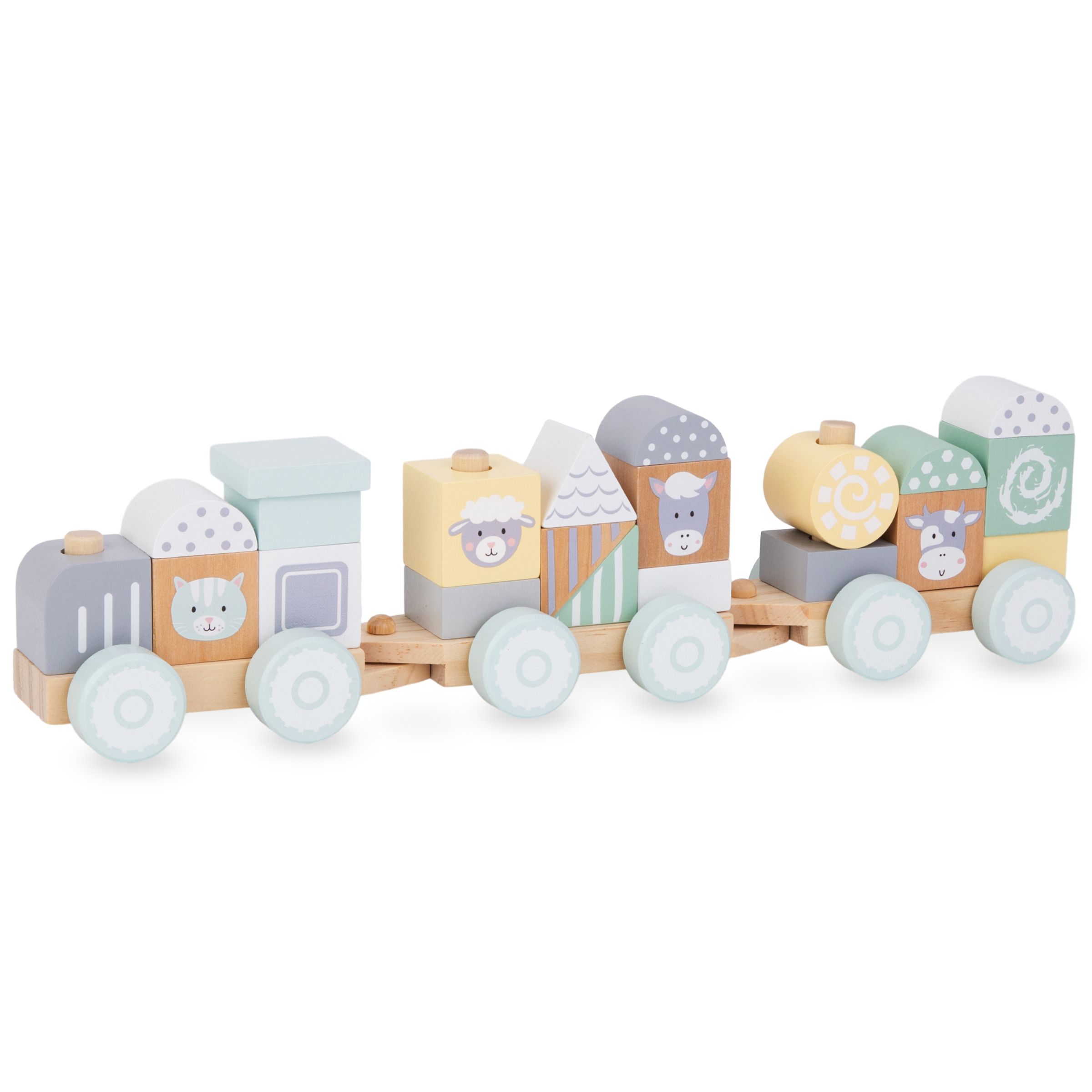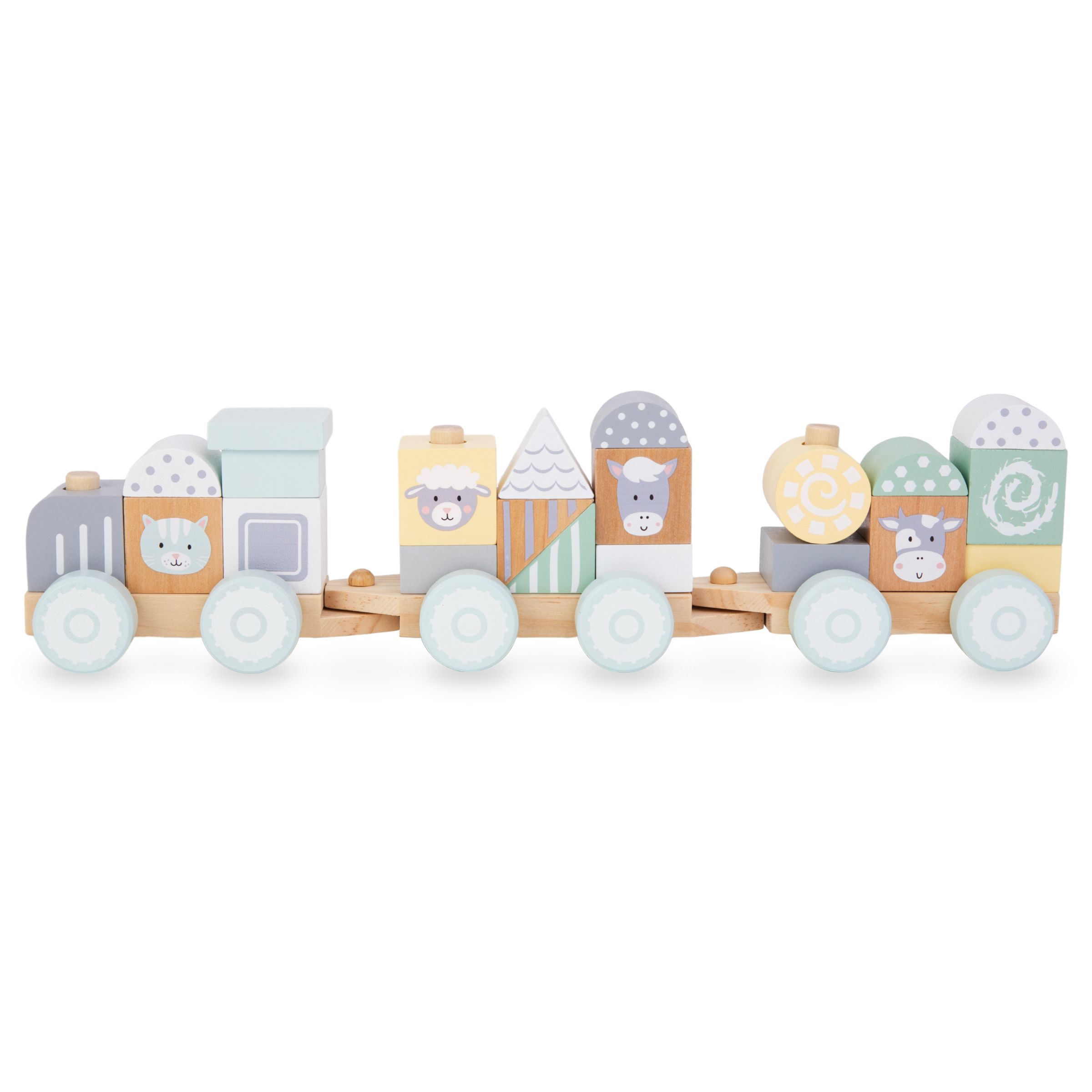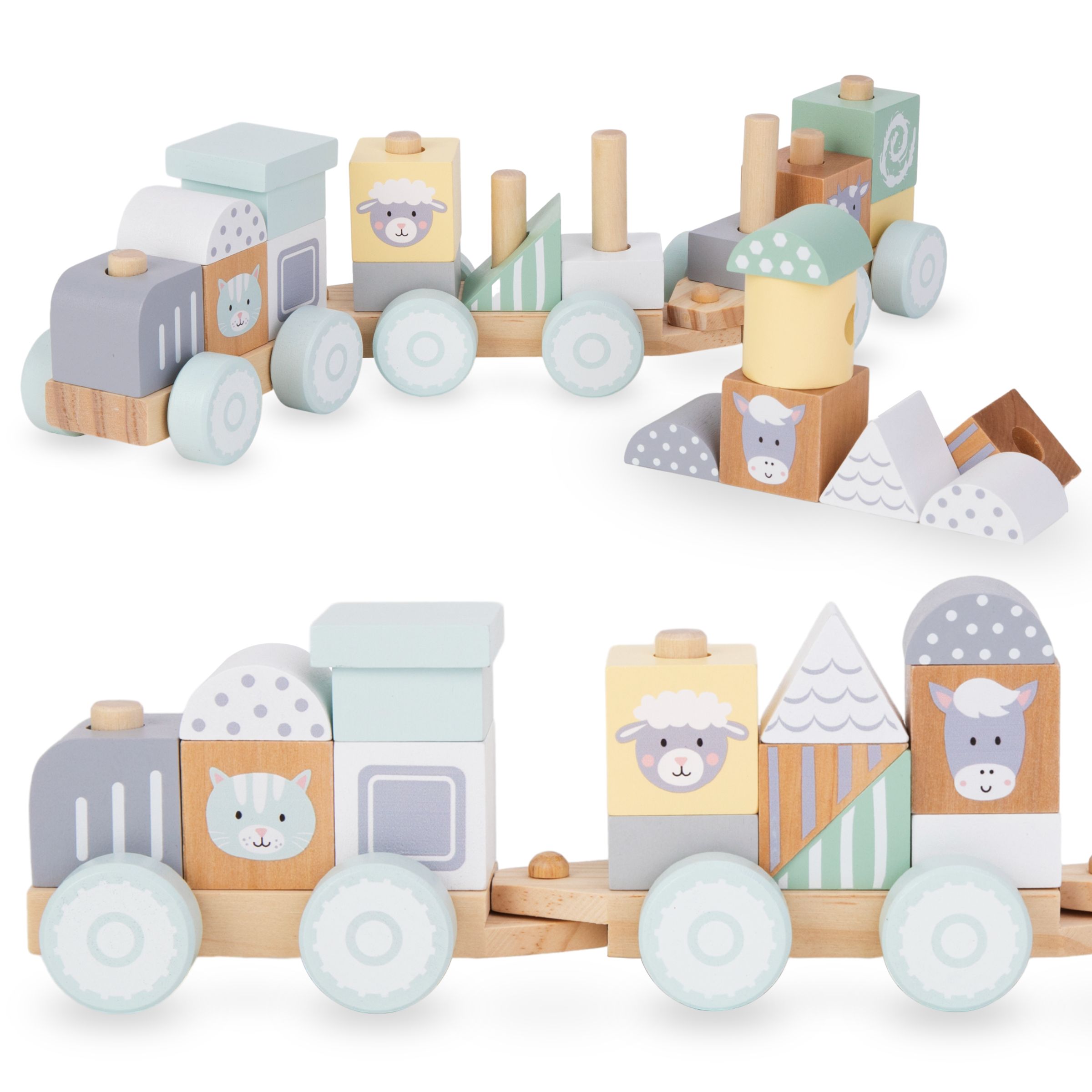 Vognene i træ med hjul kan sættes sammen til et unikt lokomotiv. Ved at lægge de farverige klodser oven på de særlige pløkker bygger det lille barn en unik togkonstruktion. Toget kan se forskelligt ud hver gang! Når alt er klar, er det tid til en tur. Under rejsen kan dit barn afmontere vognene eller ændre klodsernes placering. For at gøre legen mere varieret indeholder sættet klodser med motiver af søde bondegårdsdyr .